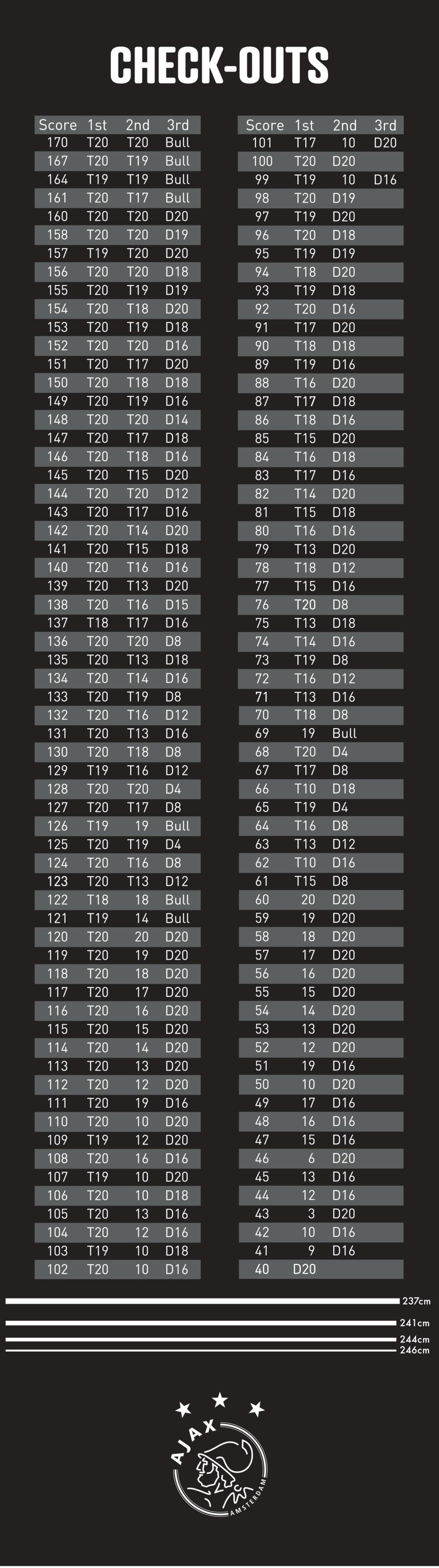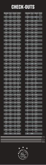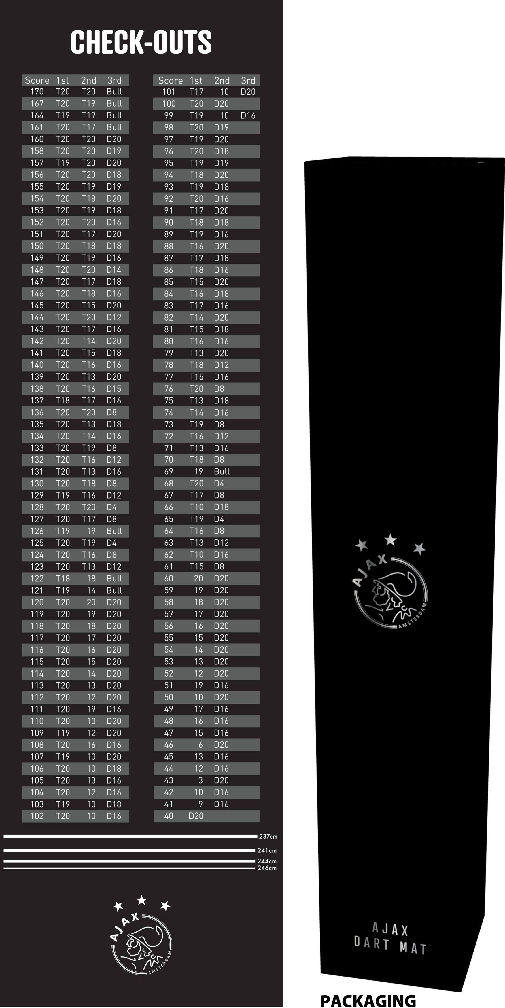 The Ajax checkout dart mat is designed for serious players and fans alike. This high-quality mat combines performance, durability, and bold branding, making it a standout addition to any dart setup.