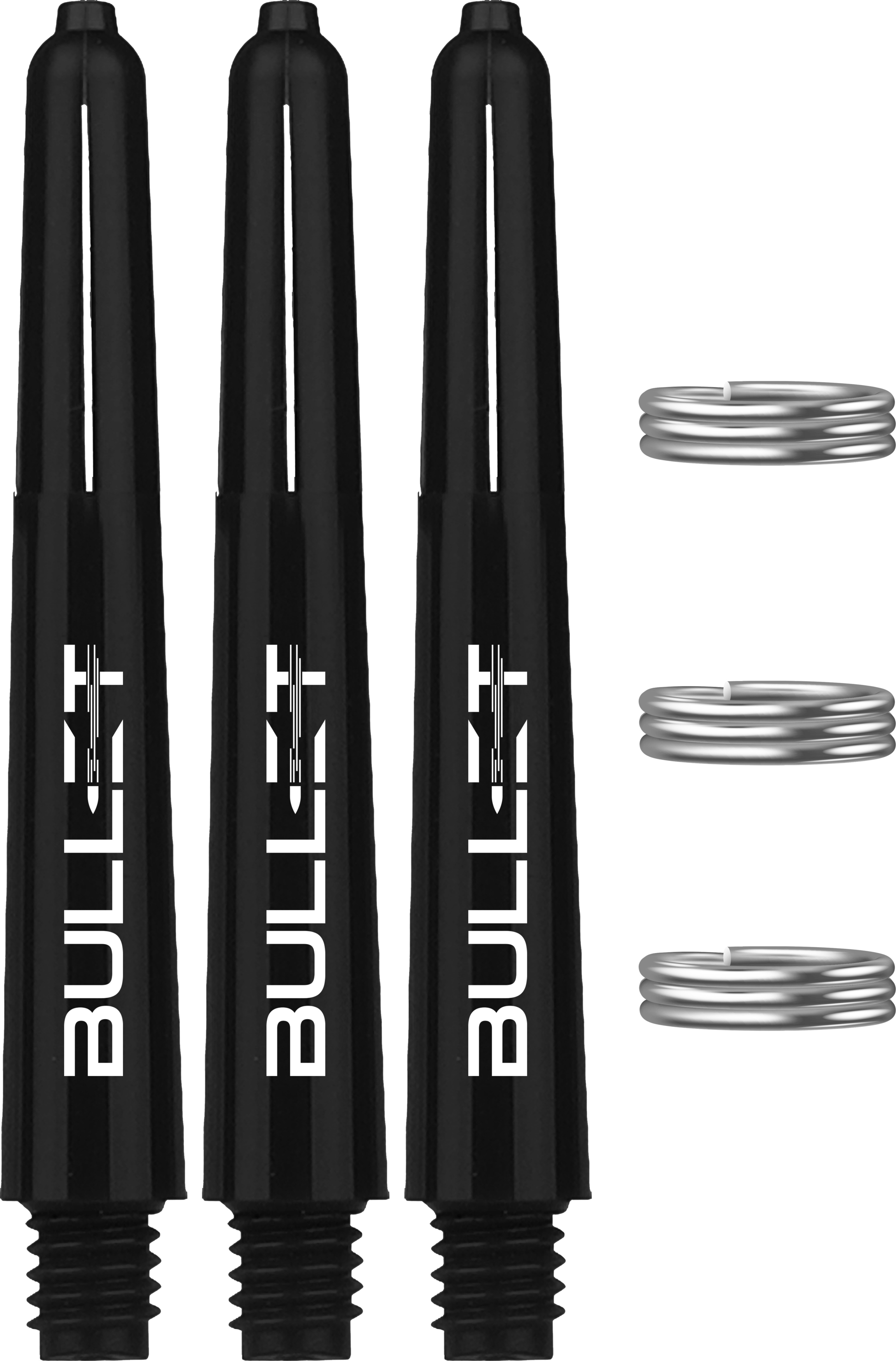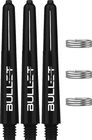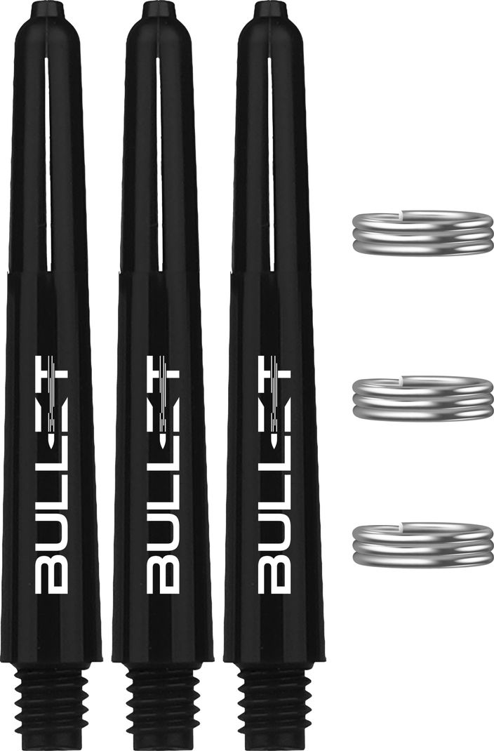 Set of 3 black Bullet shafts, 48 mm long. Features a silver Bullet logo and includes stainless steel spring rings.
