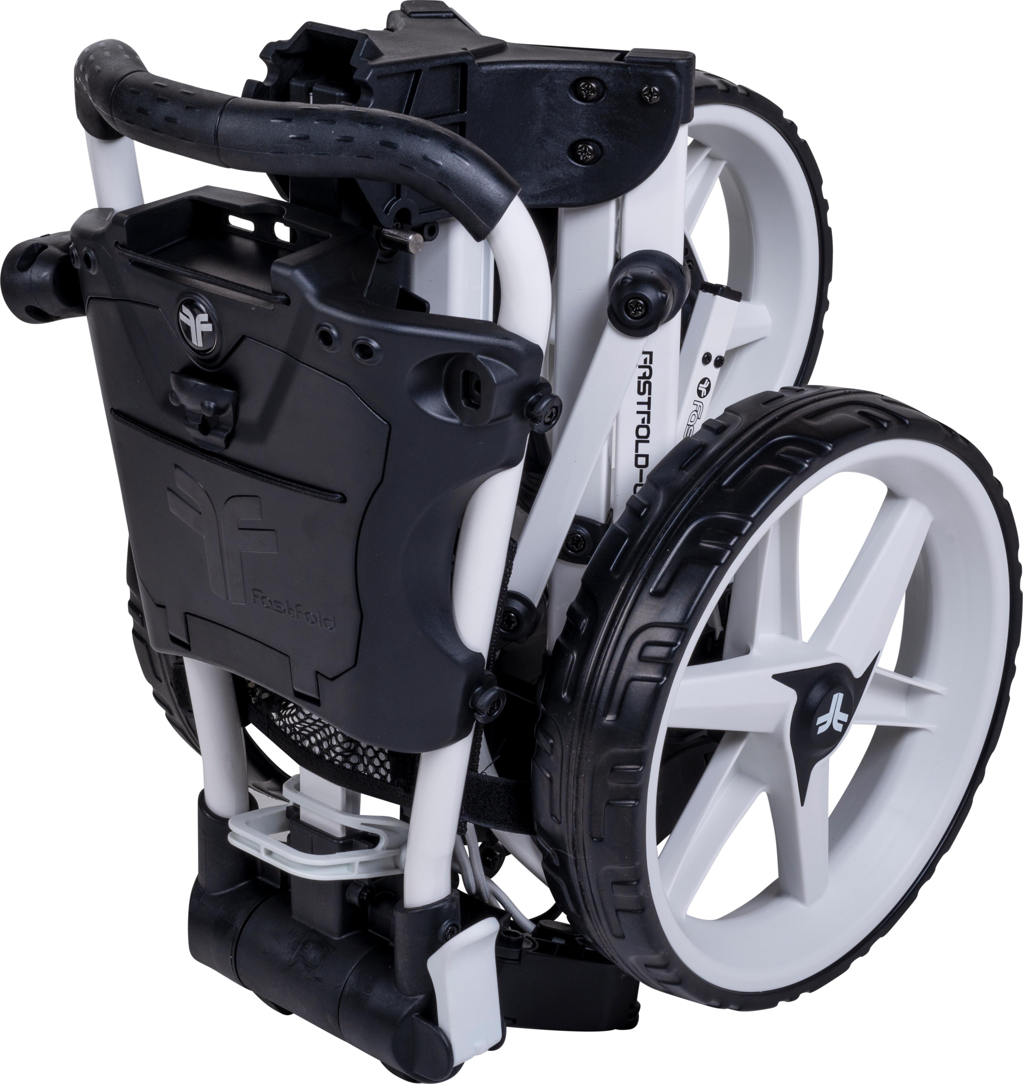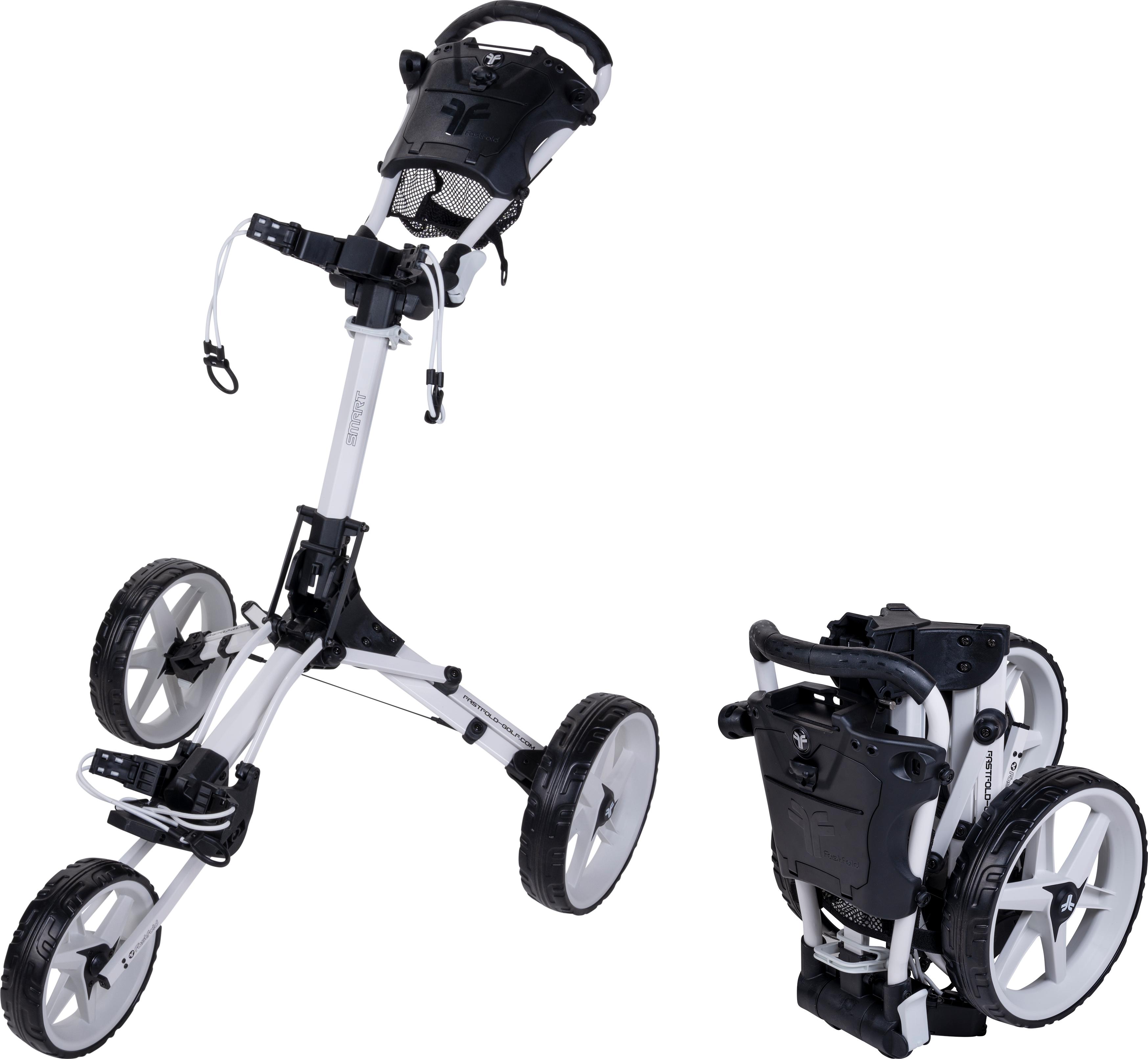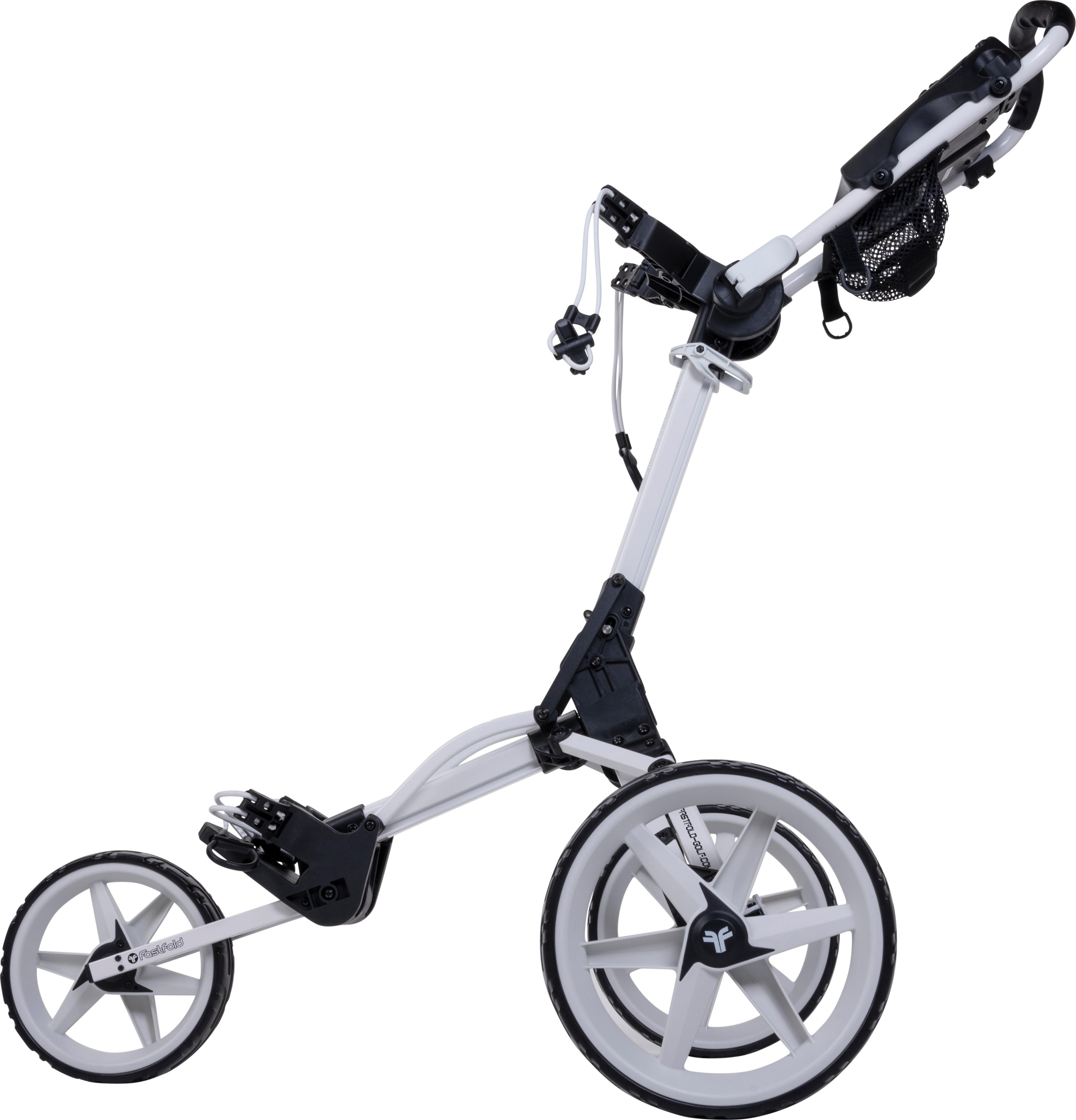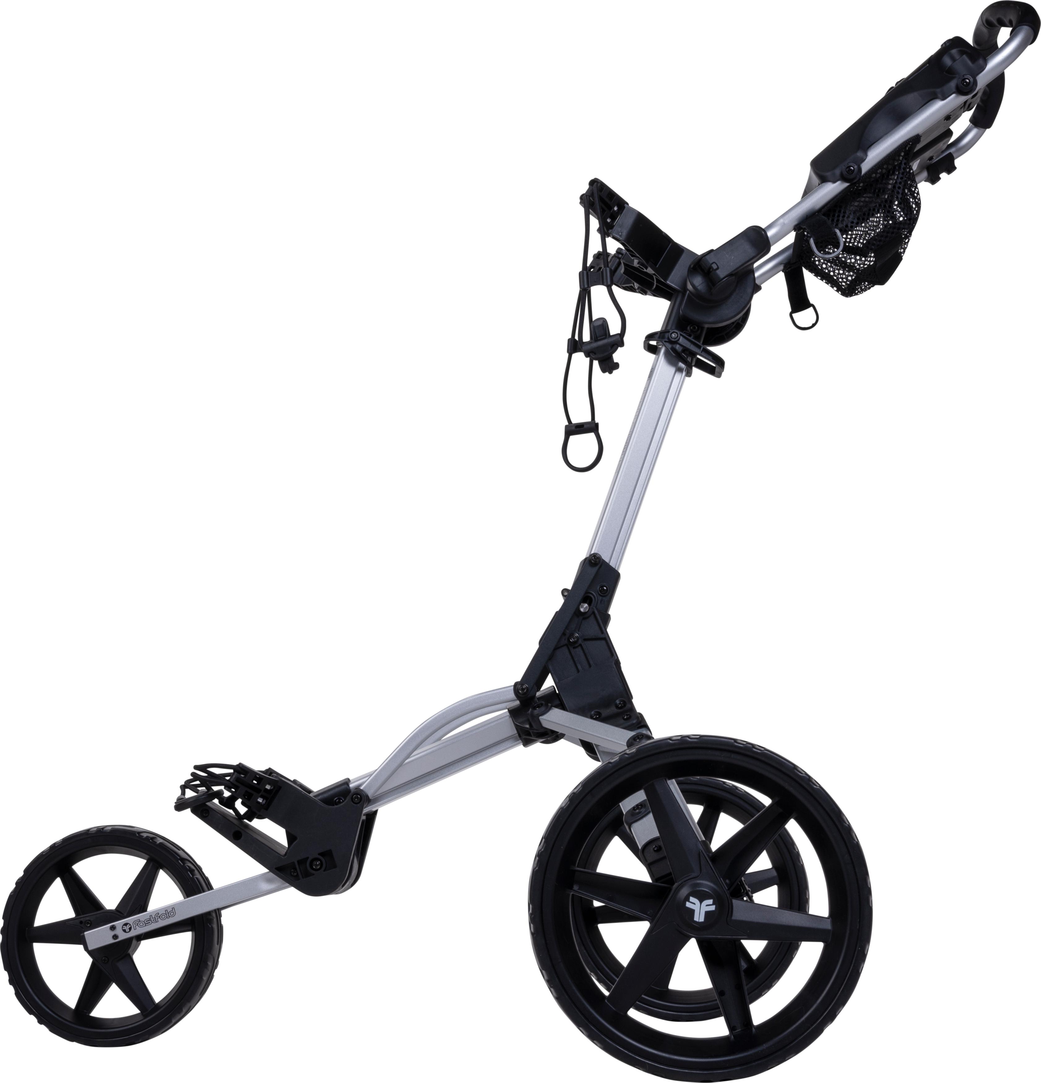 The Fastfold Smart 3 wheel trolley offers stability and convenience with its robust frame, easy-touch foot brake, and adjustable handle height. The large 12” rear wheels ensure a smooth ride, while the big scorecard holder with accessory compartment, storage net, and phone holder keep essentials within reach. Designed for both cart bags and stand bags, the special bracket securely accommodates stand bag legs for a perfect fit. With a compact folded size (510 x 350 x 450 mm), it’s easy to store and transport—perfect for any golfer!