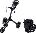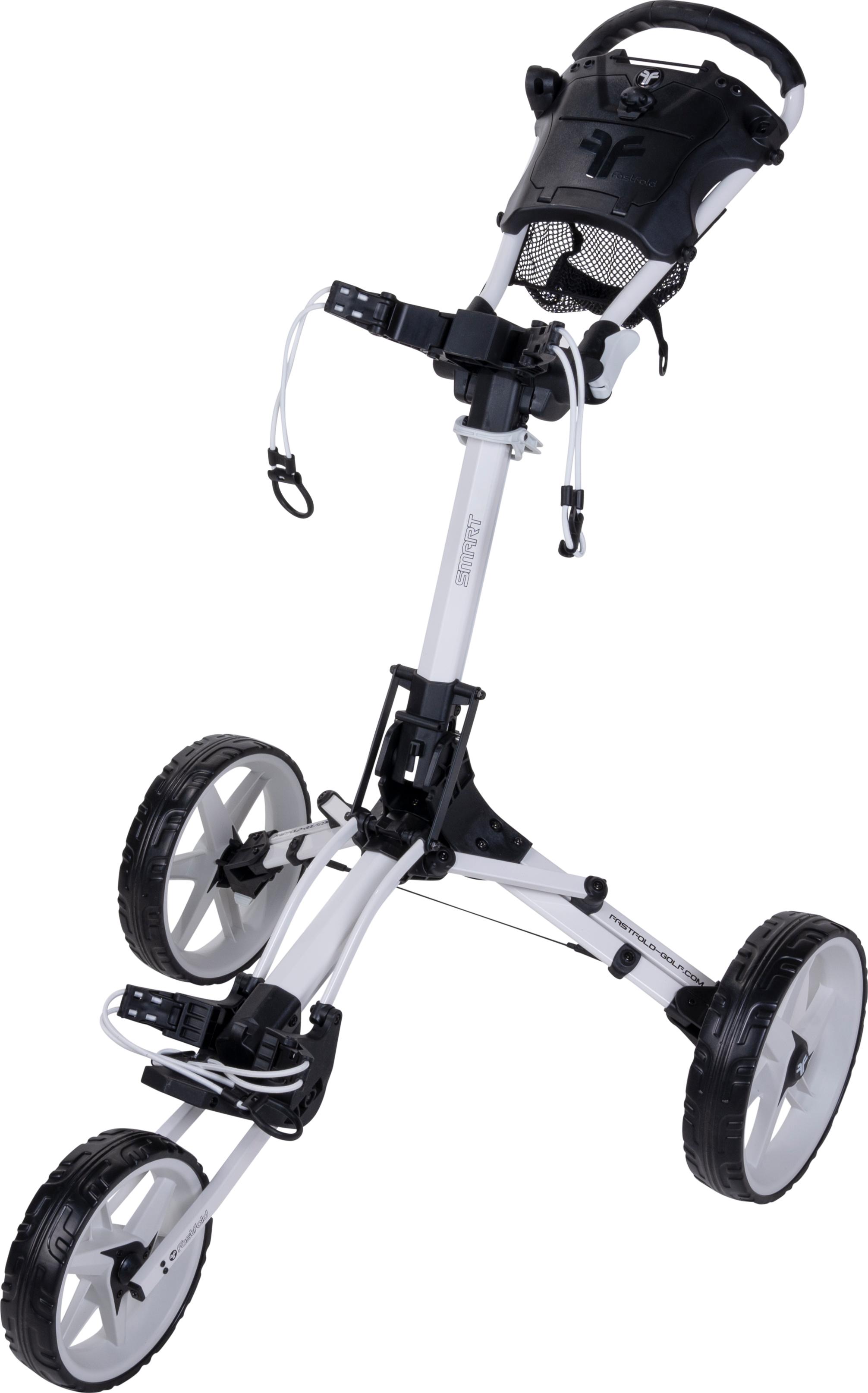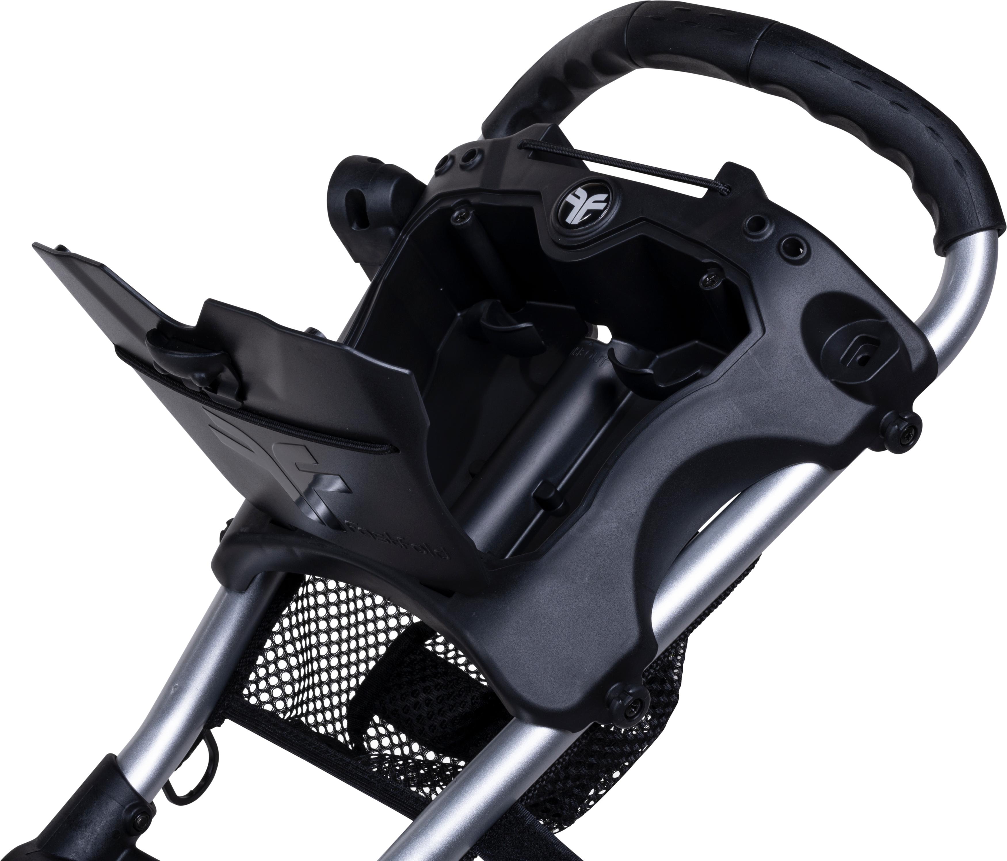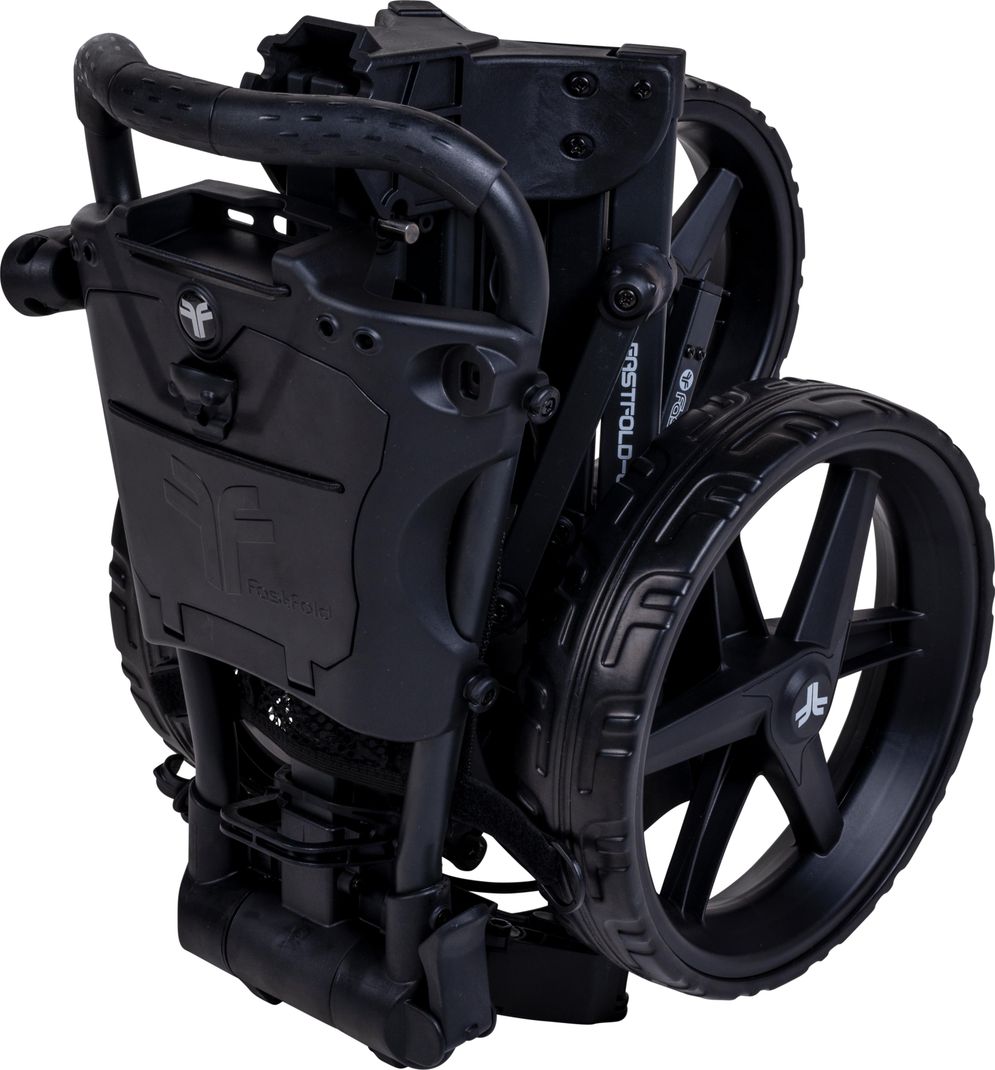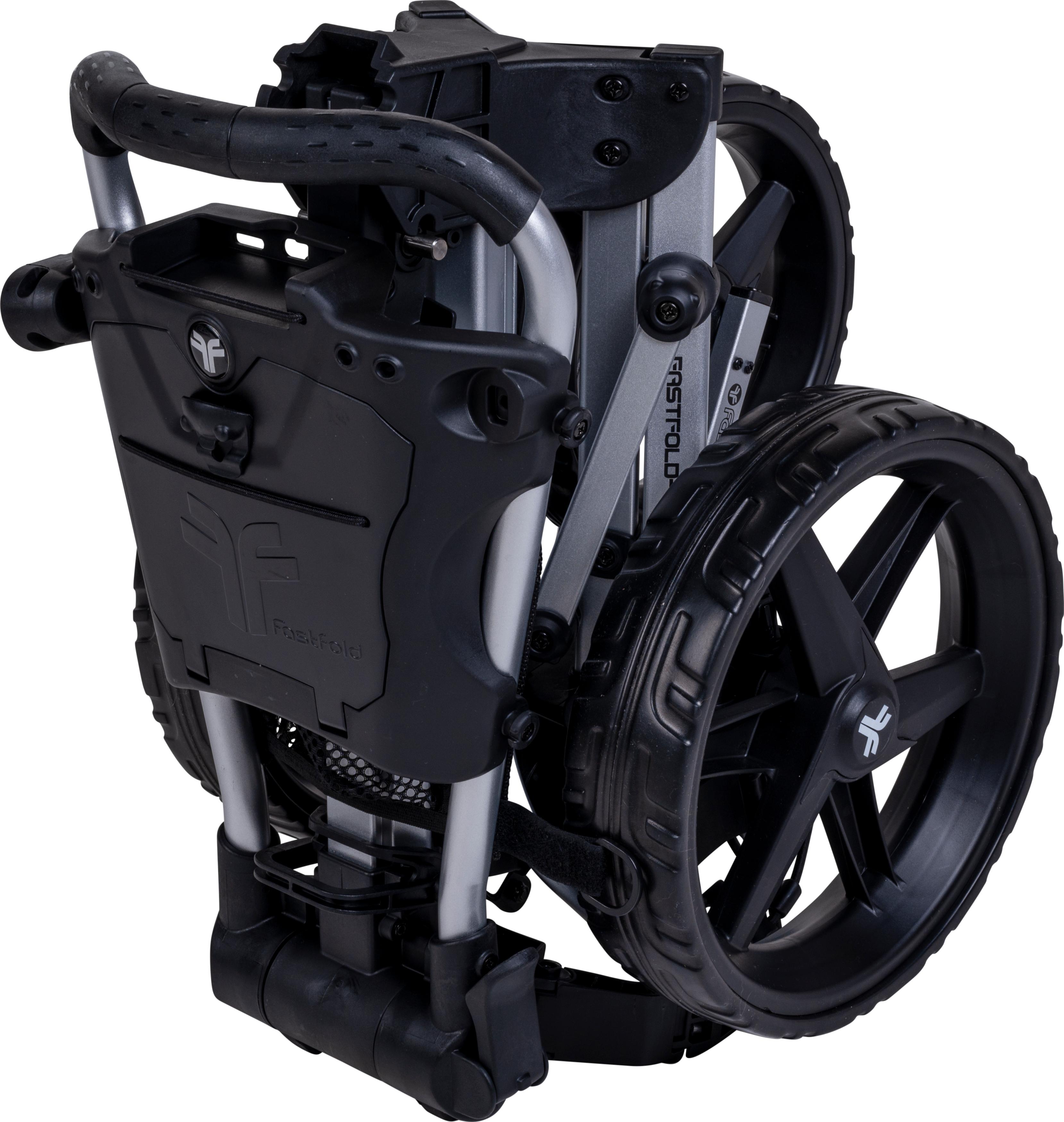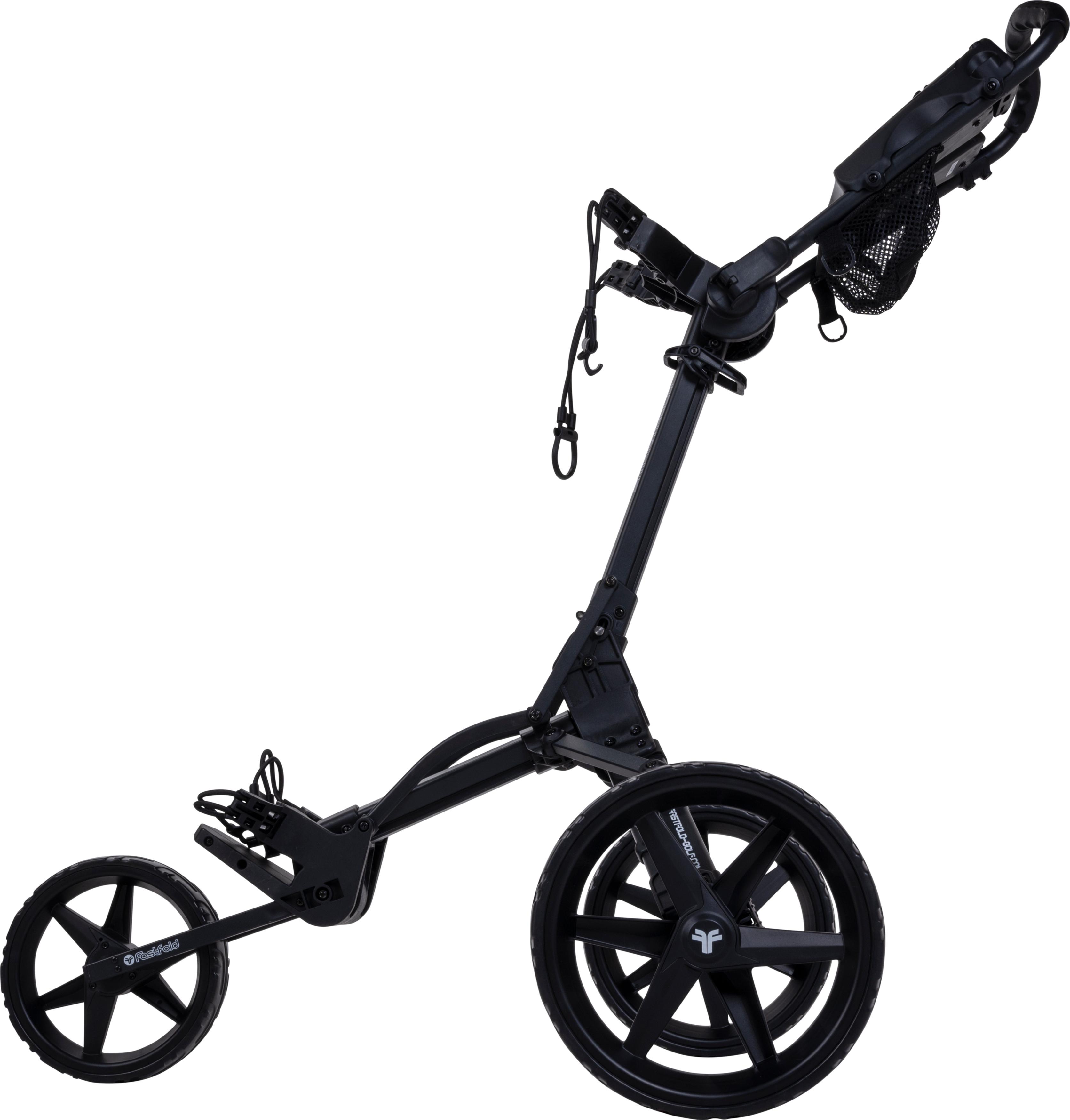 The Fastfold Smart 3 wheel trolley offers stability and convenience with its robust frame, easy-touch foot brake, and adjustable handle height. The large 12” rear wheels ensure a smooth ride, while the big scorecard holder with accessory compartment, storage net, and phone holder keep essentials within reach. Designed for both cart bags and stand bags, the special bracket securely accommodates stand bag legs for a perfect fit. With a compact folded size (510 x 350 x 450 mm), it’s easy to store and transport—perfect for any golfer!