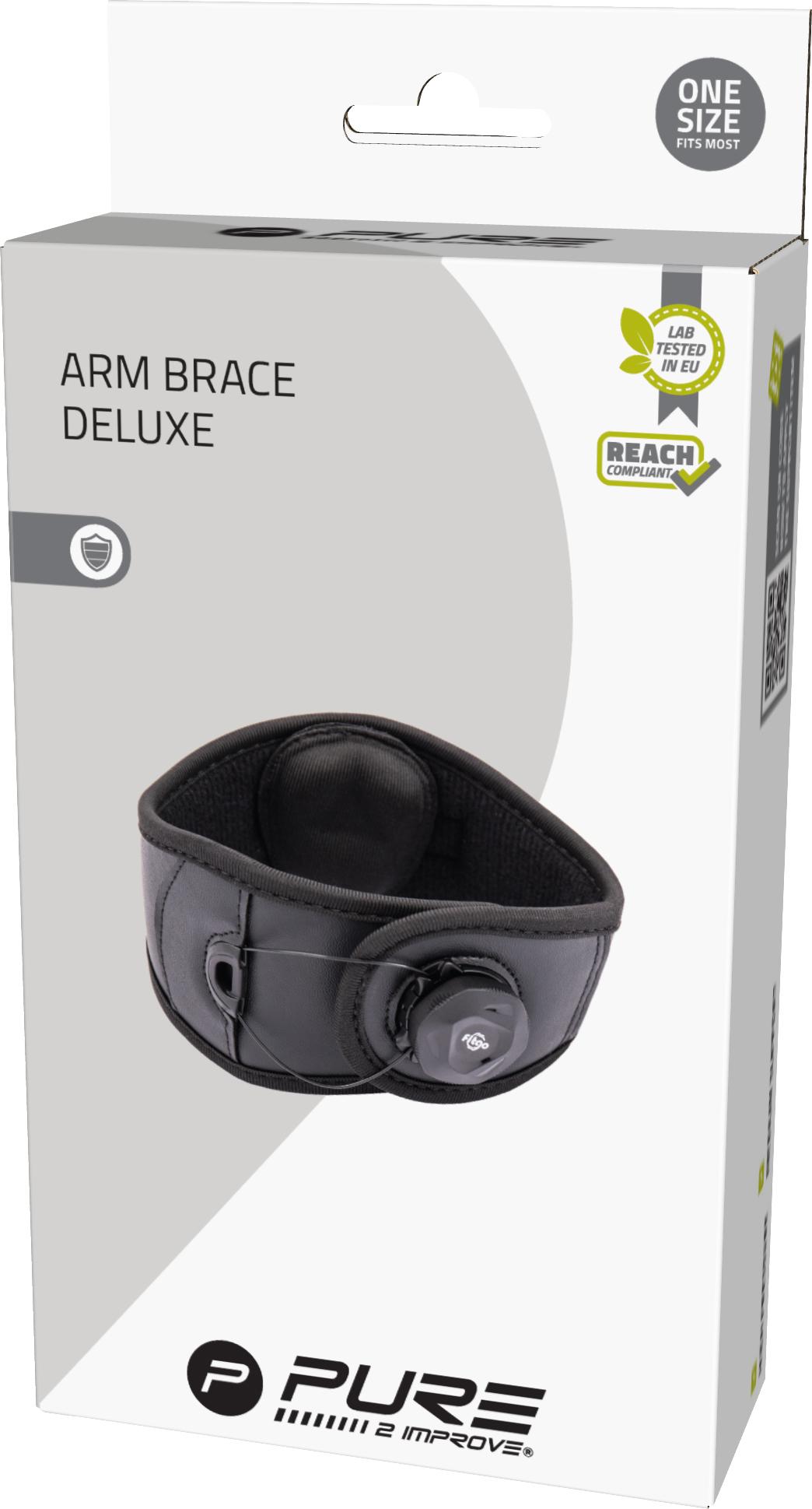 The arm brace deluxe is suitable for a tennis arm (lateral epicondylitis) or golf arm (medial epicondylitis). The strap is easily adjustable and has excellent wearing comfort. One size fits most.