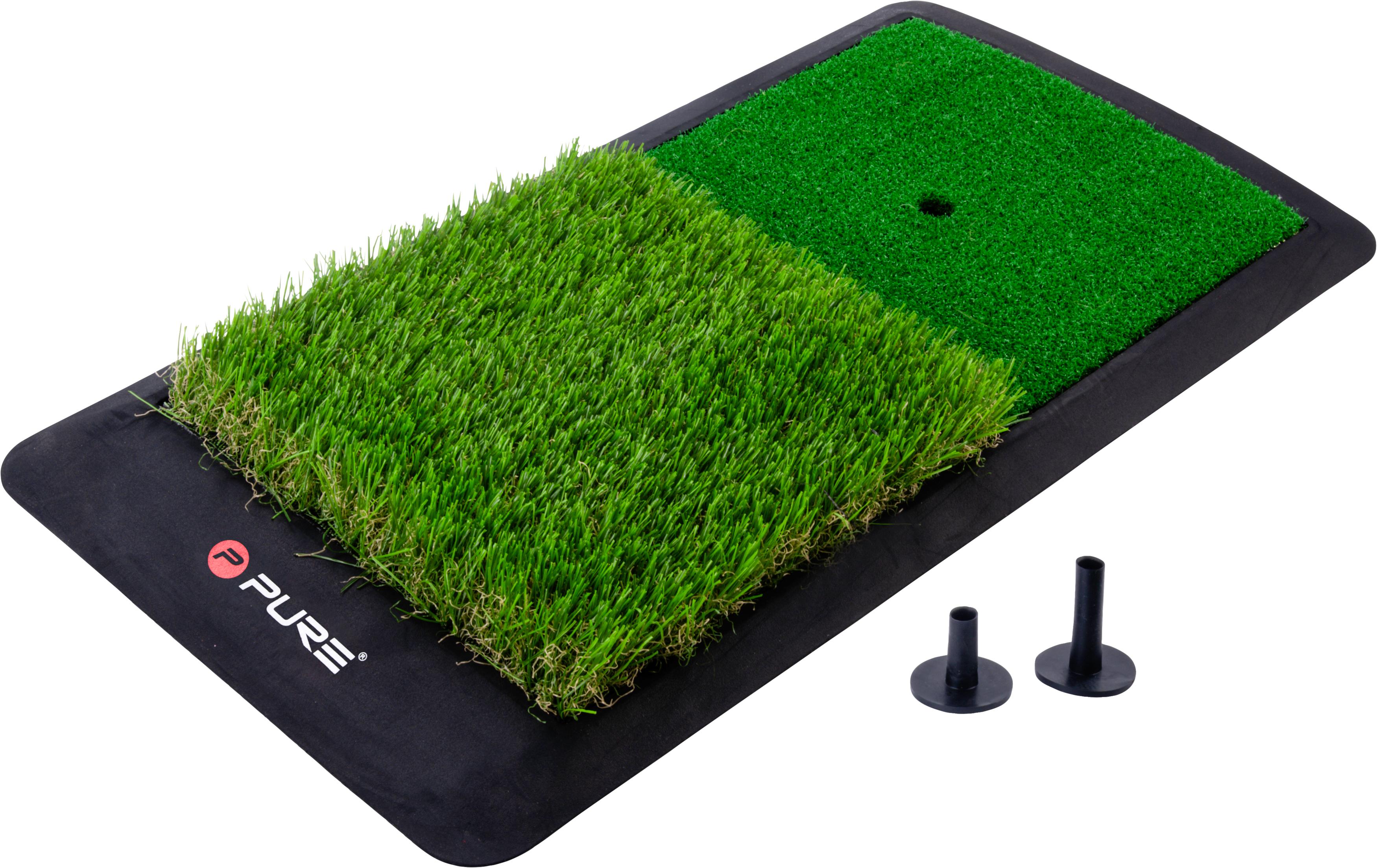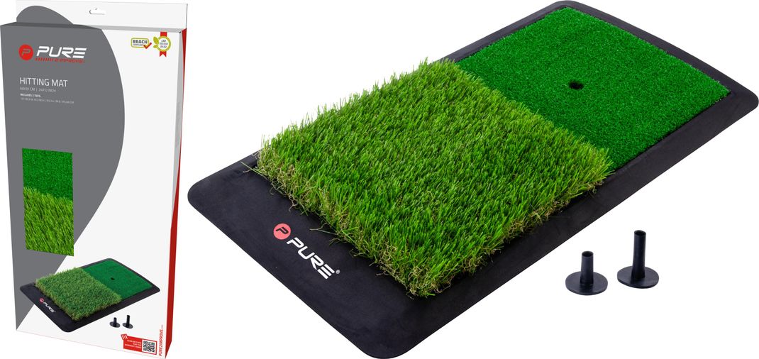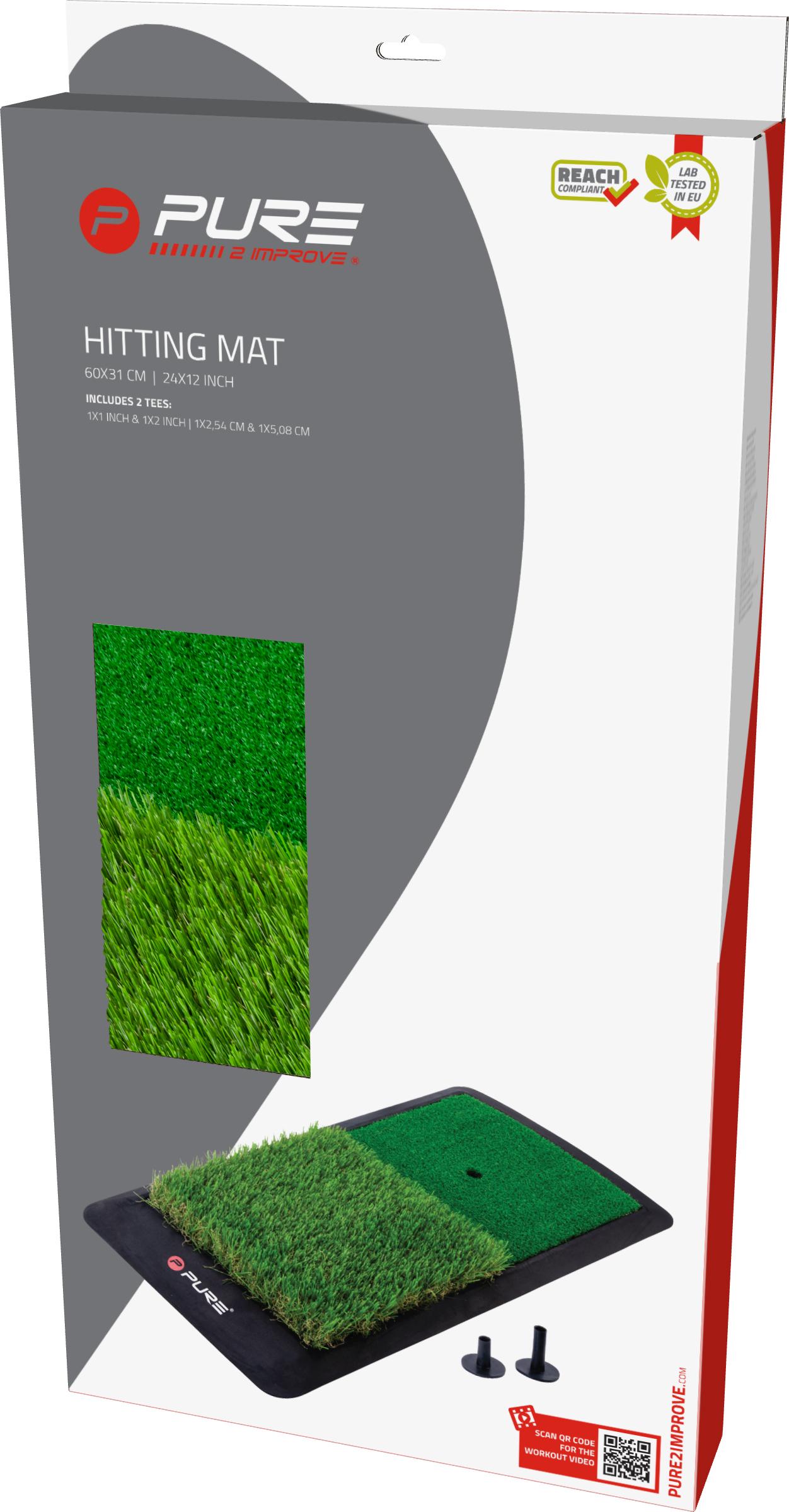 Pure 2Improve Hitting Mat Dual Turf, 60x31cm. Not single but dual turf hitting mat! For more diversity in your practice sessions. Tired of smashing your lawn? Don't have a lawn? Then the Pure 2Improve hitting mats are the best outcome for your practice sessions. This set contains the dual turf mat, a 1 inch rubber tee and a 2 inch rubber tee, but excluding a golfball. Due to its rubber base it is a very steady hit mat. Can be used in/outdoors in all weather conditions. Ideal in combination with the Pure 2Improve practice and chipping nets.