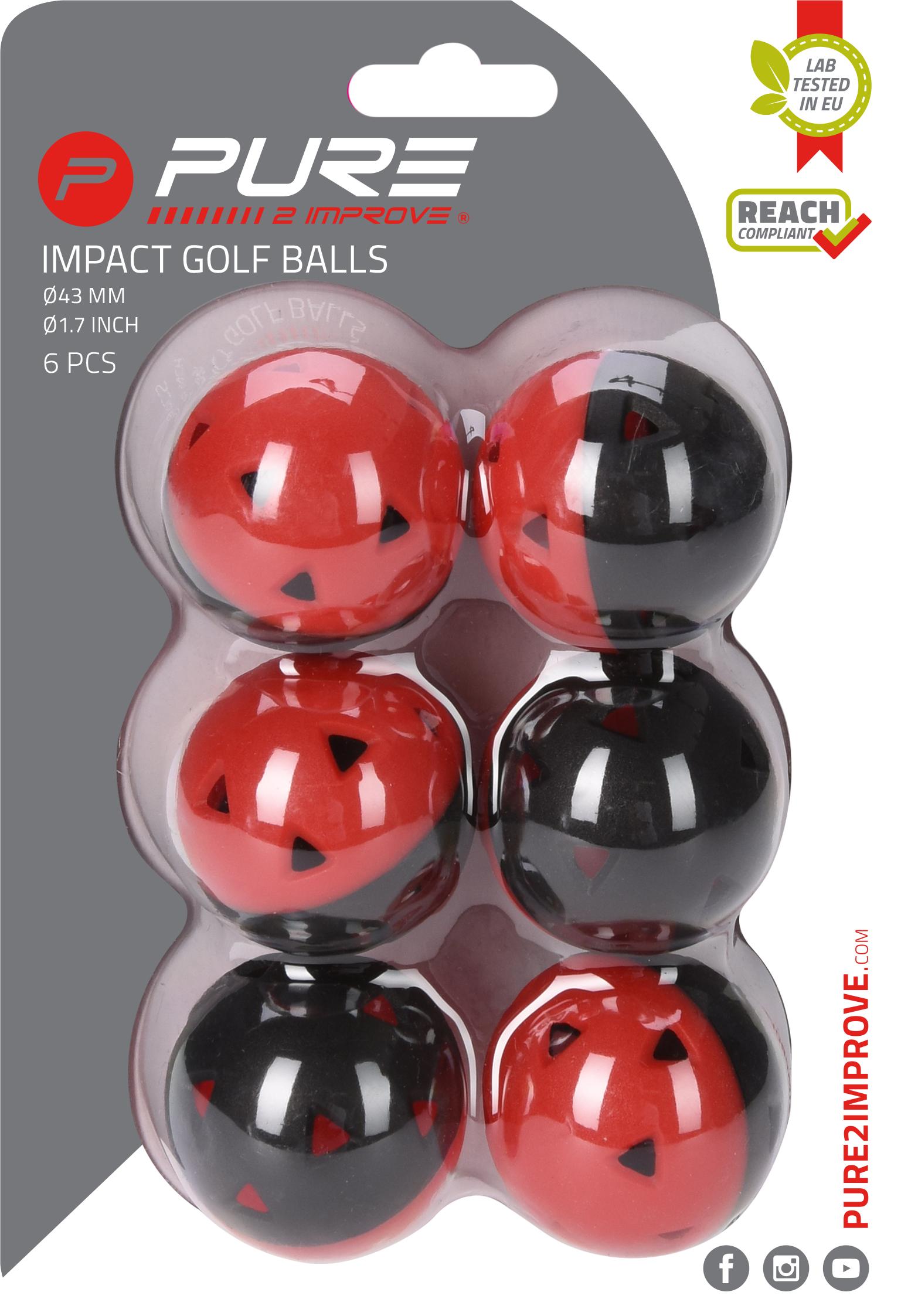 Impact Golf Balls, set of 6 pieces. The Impact Balls are a great alternative to plastic training golf balls, perfect for practicing at any time and place you wish. The impact balls are made of durable plastic, and therefore indestructible and resistant to dents. Flight distance of approximately 40 meters. Ideal in combination with other Pure 2Improve golf training tools.