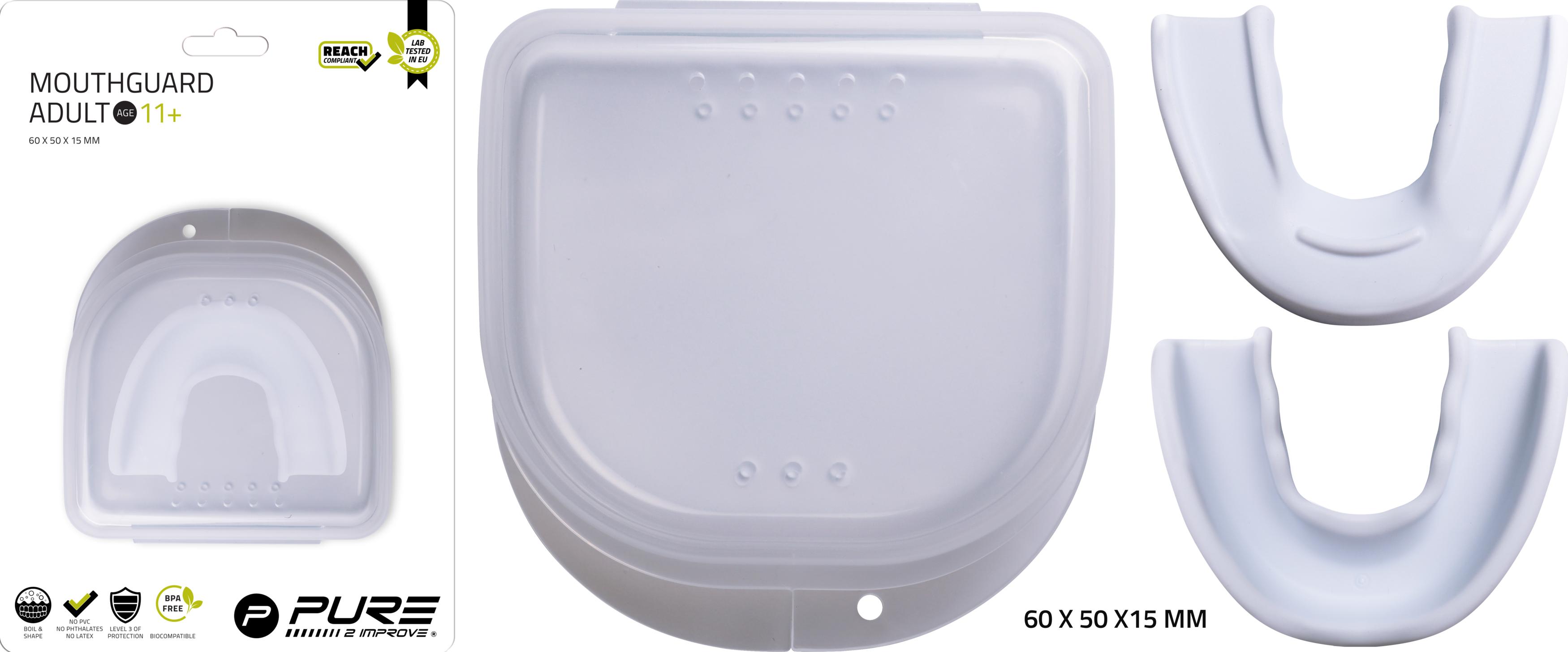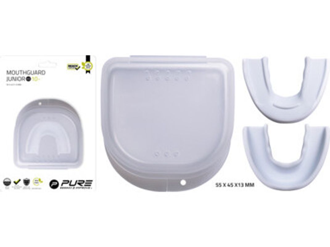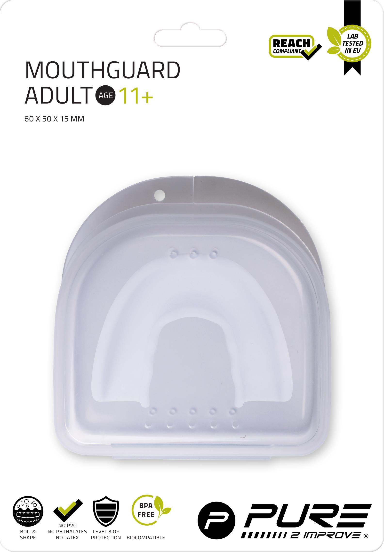 The Pure 2Improve mouth guard is perfect for athletes who want to protect their teeth. This mouth guard absorbs shocks, reduces vibrations, and keeps teeth from clashing during sports like basketball, cricket, hockey (except ice-hockey), rugby, lacrosse, and certain martial arts. It’s designed for comfort, allowing you to breathe, swallow, and speak normally. With the highest protection level (Level 3), you can be confident in its safety. It’s not for people with braces unless approved by your dentist. Furthermore, it's Certified by SATRA Technology Europe Ltd. Follow the instructions to ensure a snug fit for the best protection during your activities.