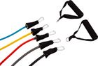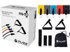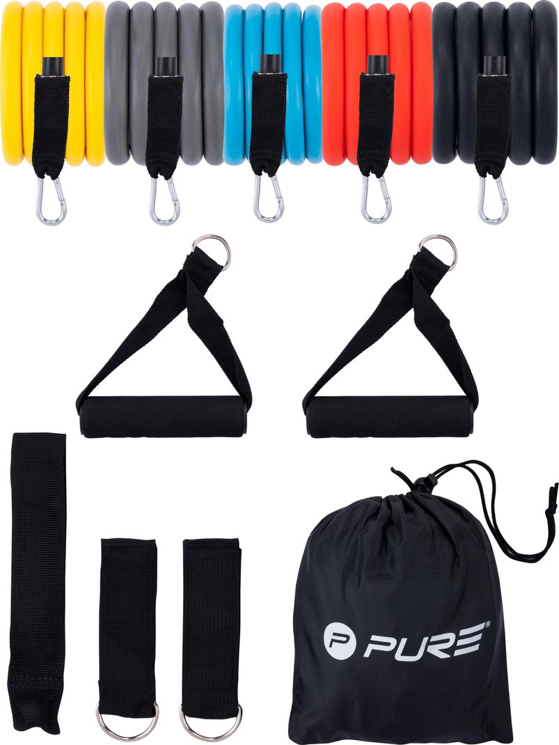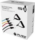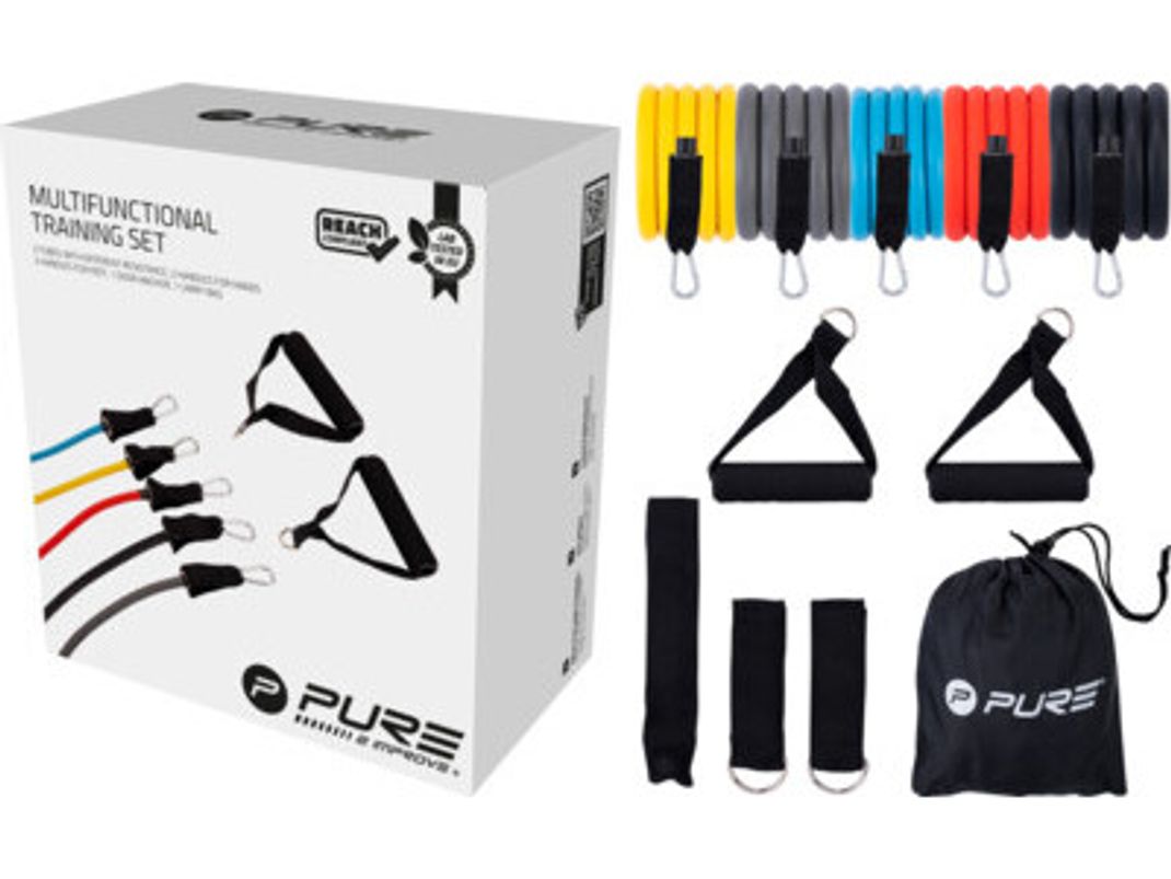 The Multi functional Training Set consists of various sturdy and durable fitness elastics. You can perform numerous exercises with dozens of different resistance levels, by using different bands at the same time.