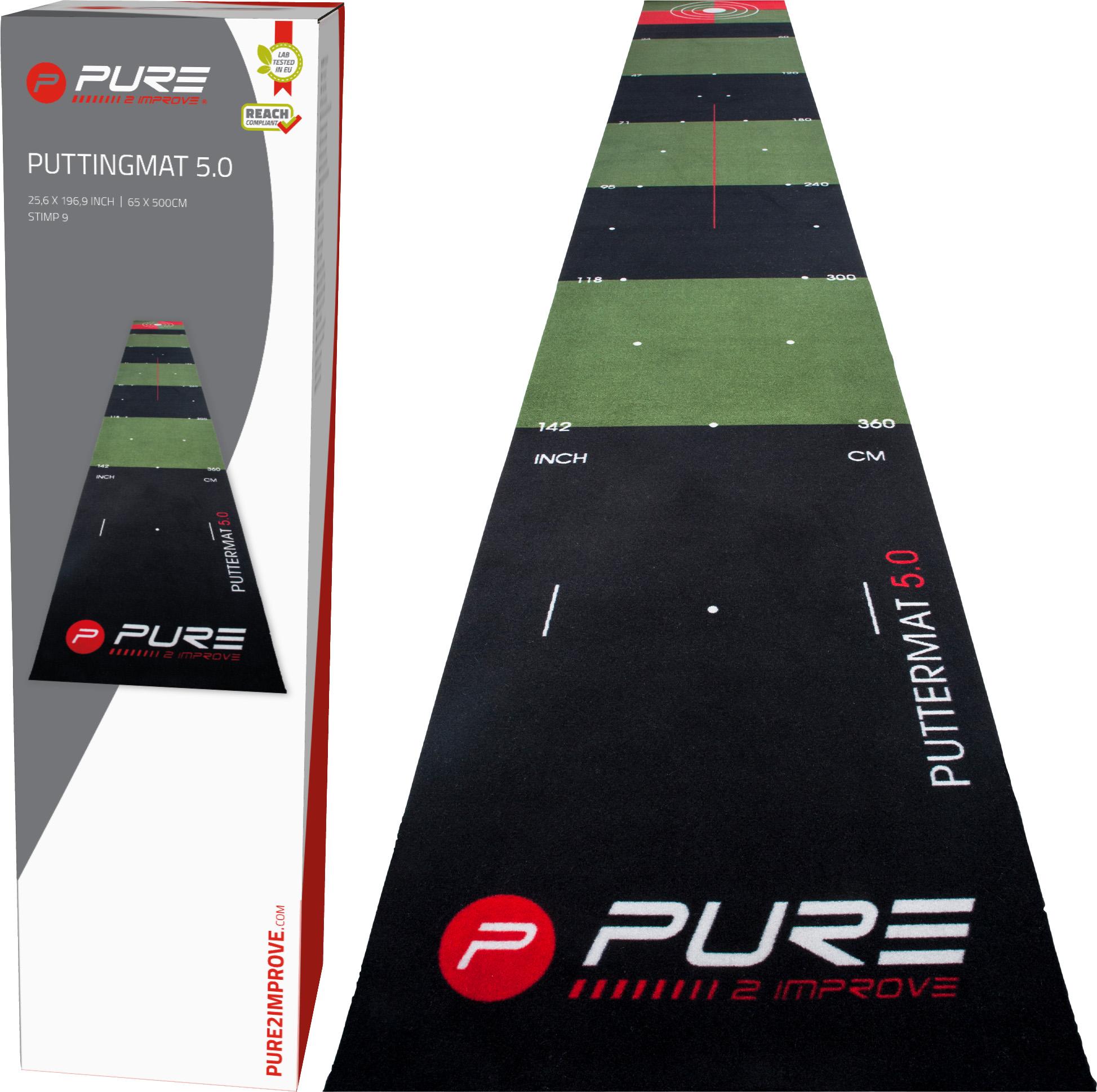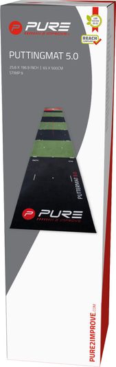 Pure 2Improve Golf Putting Mat 5.0, 65x500cm. Improve your putting game with this Pure 2Improve 5 meter putting mat. Different visual aids helps you to practice distance control, aim and has alignment aids to help you position correctly. The various dots on the surface are for different angles of approach. The surface of the mat is created to match the speed of a real green! Also ideal in combination with other Pure 2Improve golf training tools. Can be used by all players who want to improve their putting game.