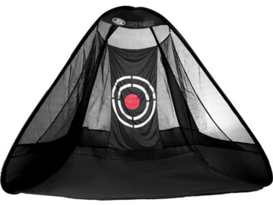 Skymax triangle shaped golf practice net in black with target. Size: 295x197x177 cm