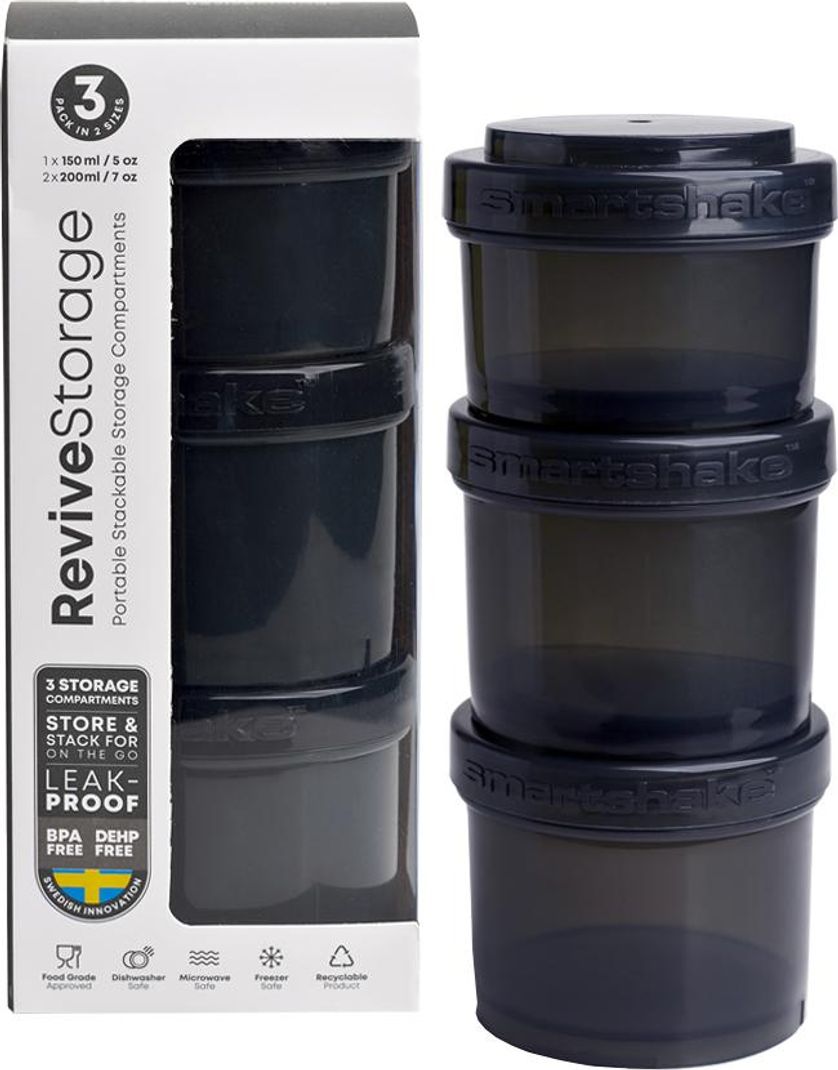 Stay smart with the Revive Storage. Some things shouldn’t mix until you want them to. Leave all clumsy wrappings at home to bring all your body fuel in one smart pack. Use separately, stack them, or attach to your Smartshake Revive. Whatever you bring. Wherever you go. With the capacity of 200 ml.