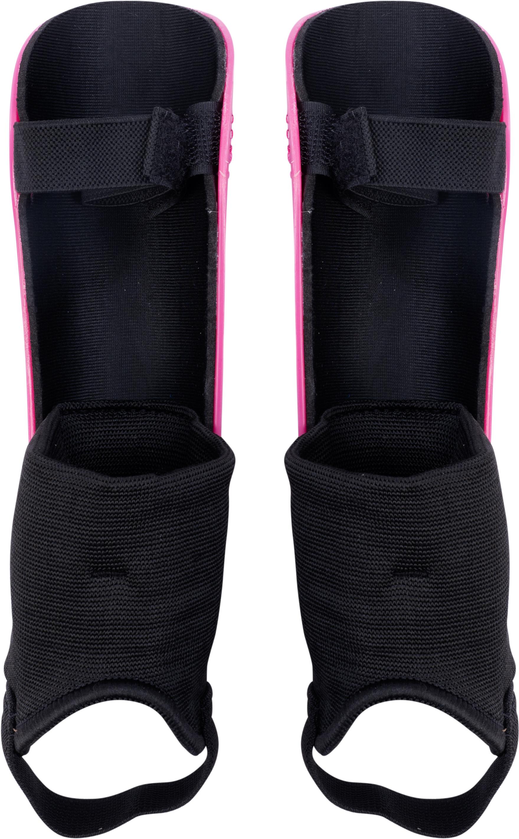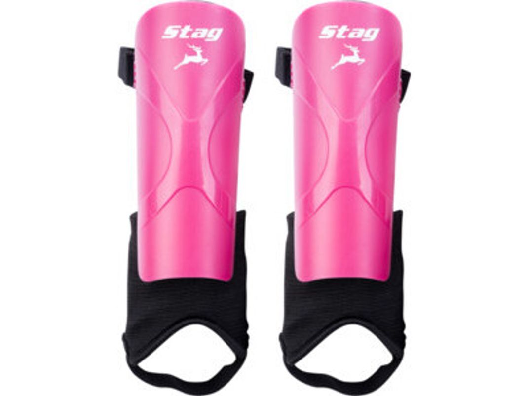 The Stag S3 Junior Shin Guard in pink offers an ergonomic fit with a 100% TPU injection and a knitted lining. These robust shin guards are specifically designed for field hockey, featuring an ergonomic shape tailored for both left and right legs with ankle protection.